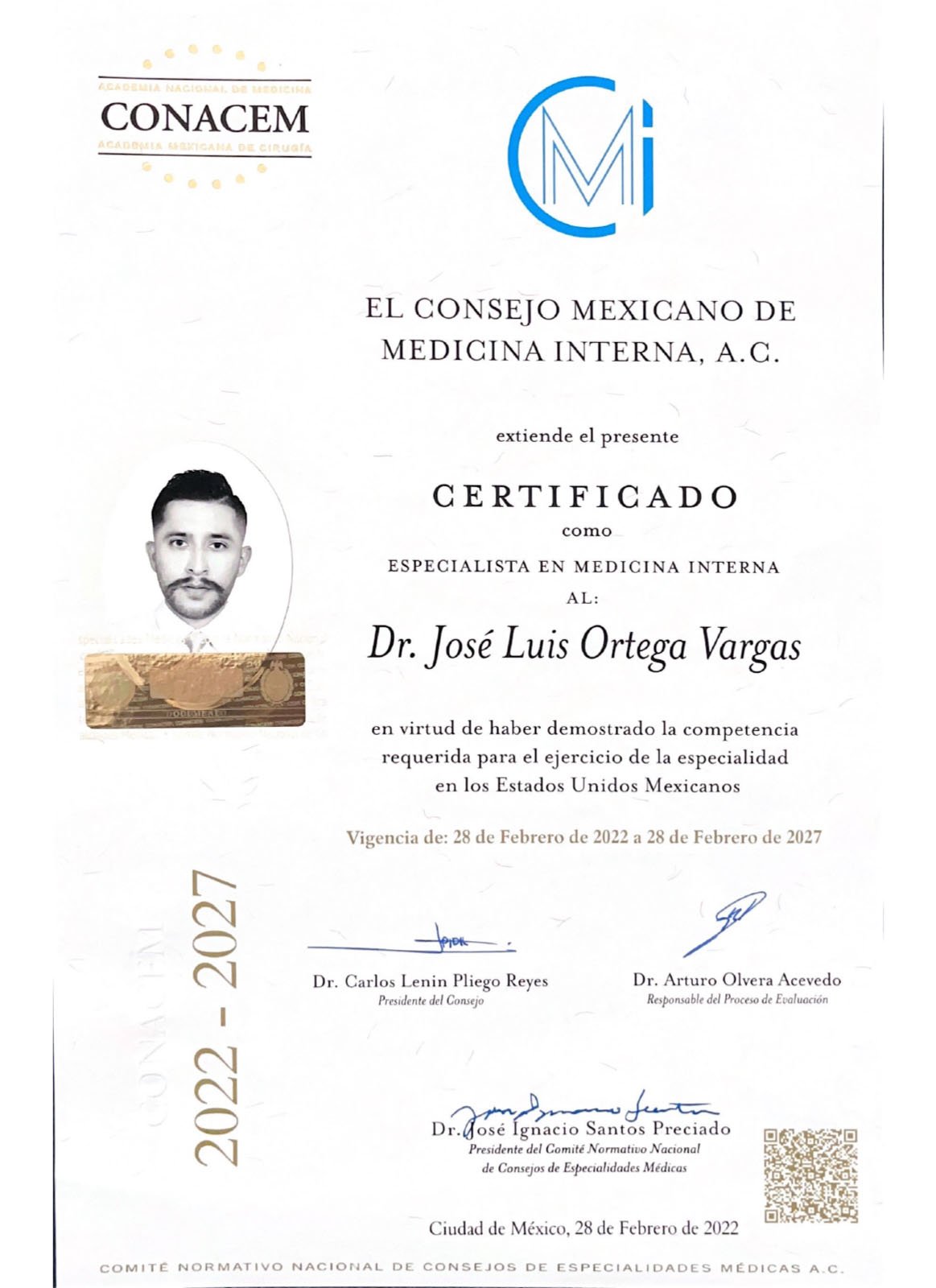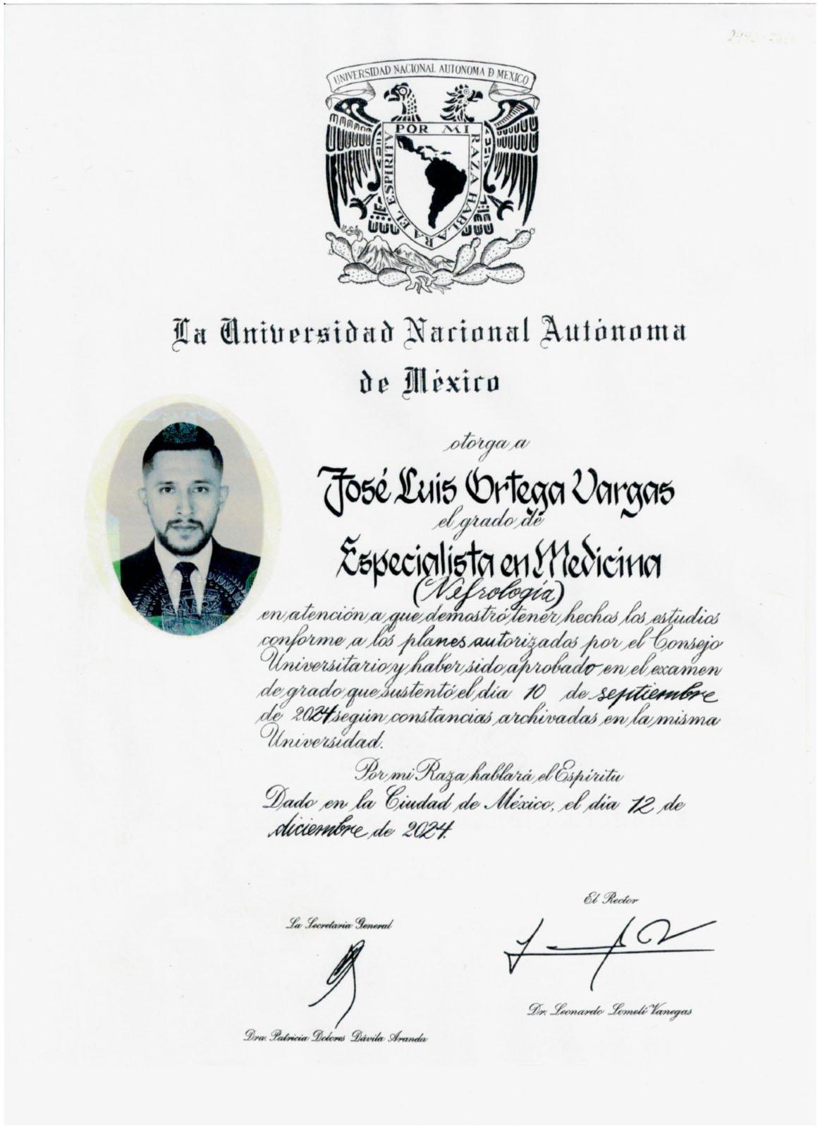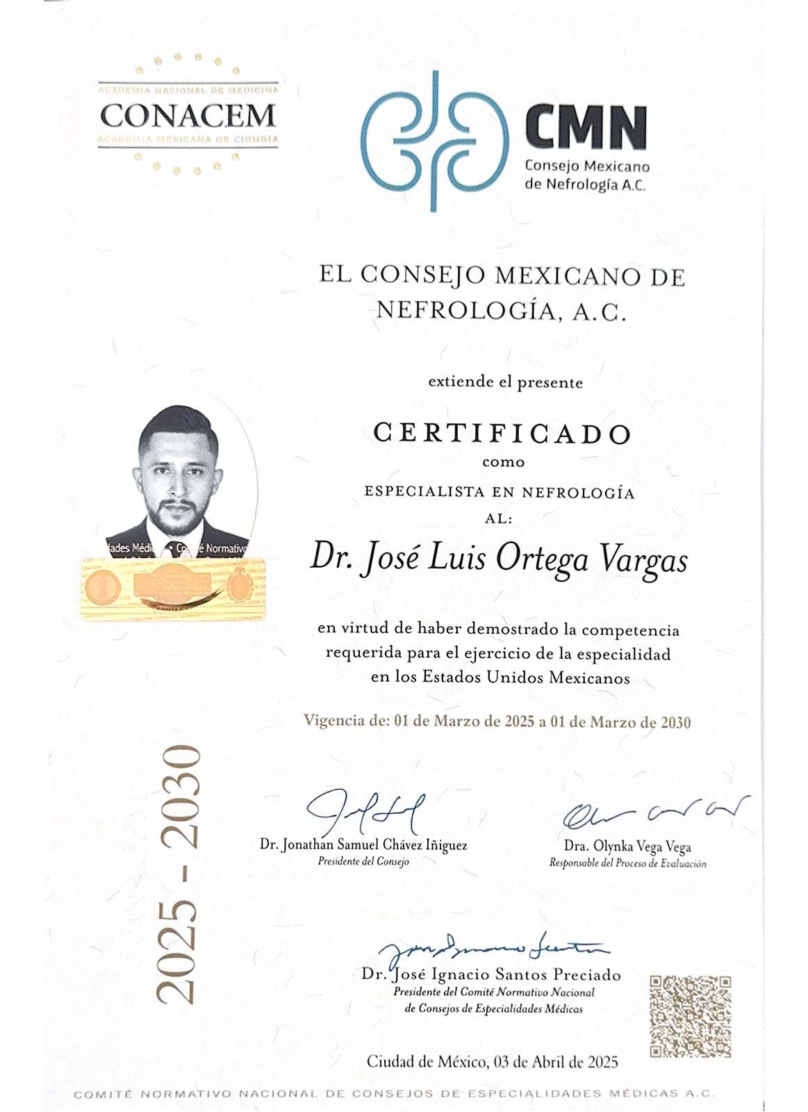 Soy el Dr. José Luis Ortega Vargas. Tras concluir la licenciatura en Medicina General, realicé la Especialidad en Medicina Interna y la Subespecialidad en Nefrología.